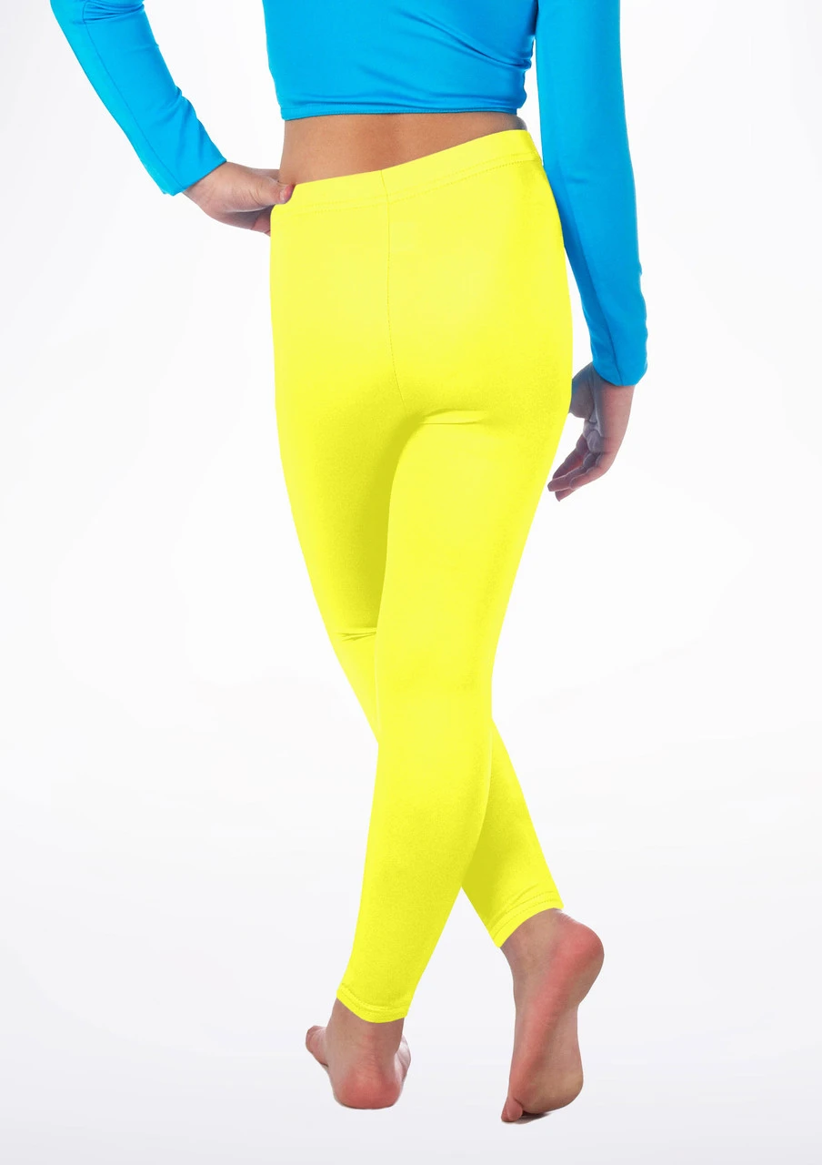 Shiny black footless leggings from Alegra for younger dancers. Flat elasticated waistband, ankle length. Perfect for dance classes, costumes, and fashion wear.