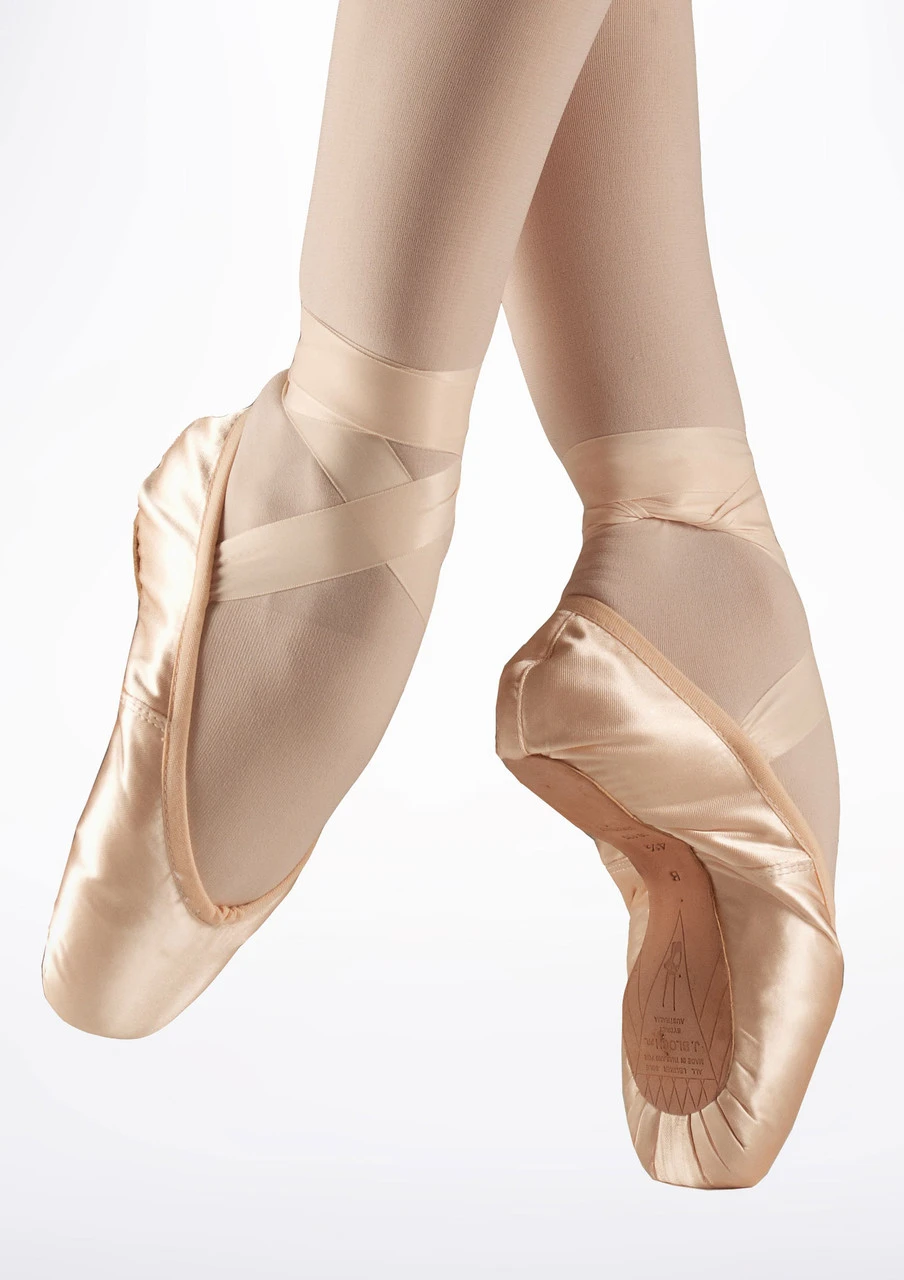 The soft block dance shoes (often called demi pointe) from Bloch. This shoe is designed to help prepare the dancer for transition from ballet shoes into their first pair of pointe shoes. In our experience of fitting these pointe shoes we measure the widths to be B (medium) C (wide)