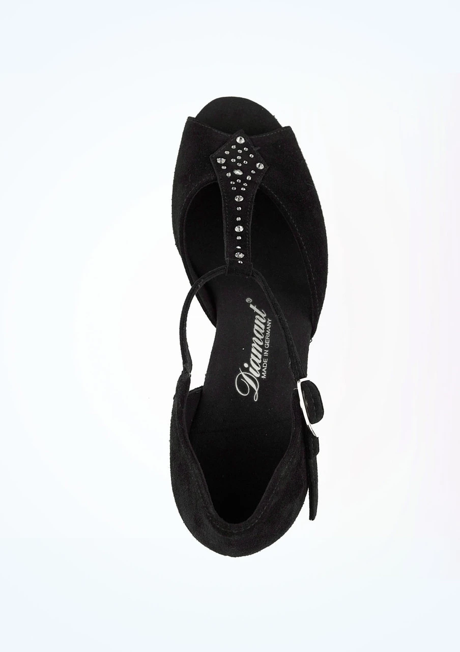 An elegant Latin dance shoe from Diamant handcrafted with a t-bar and rounded peep-toe front. The T-Bar strap fastening ensures a secure fit, embellished with twinkling rhinestones to make you sparkle on the dance floor! There is a push-button buckle for fast opening and closing for easy wear. The interior lining of this shoe is breathable and moisture-absorbent to prolong to life of the dance shoe and the soft padded sole add extra comfort. Made from a soft suede leather maximising comfort.