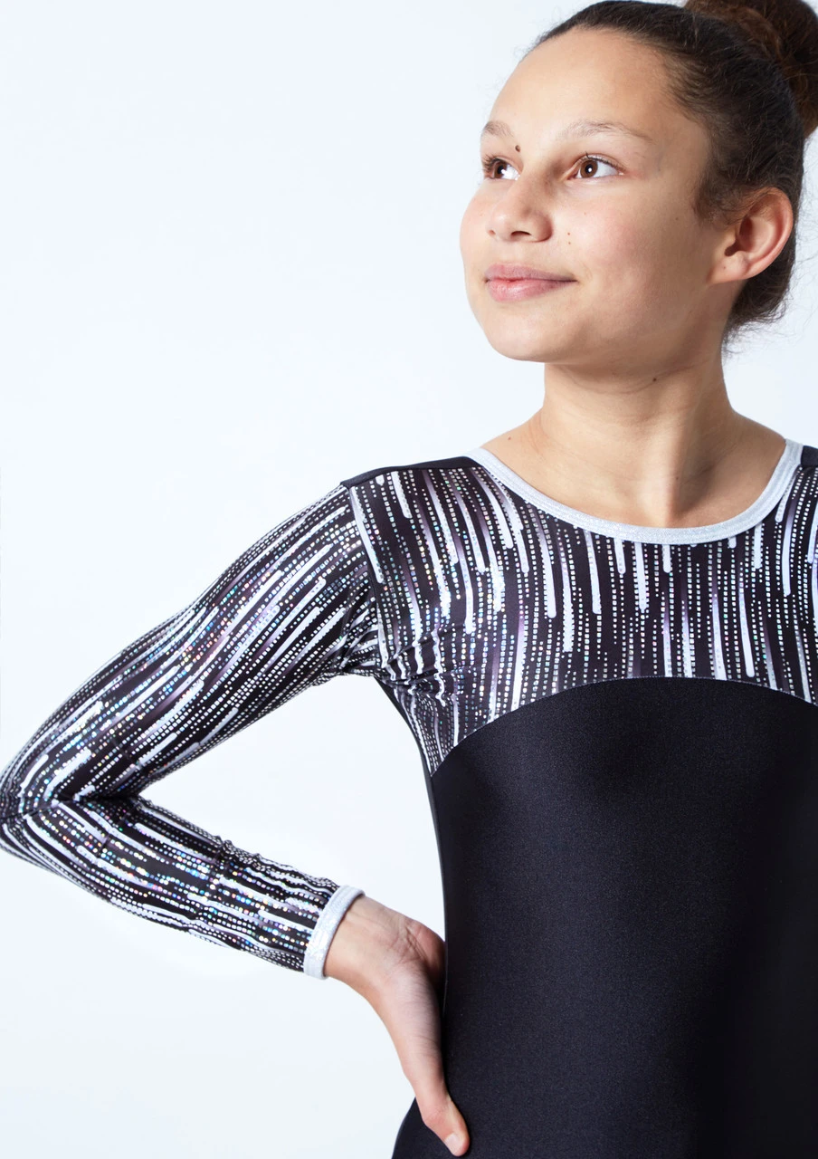 A bright long sleeved leotard that demands attention! Cascading shiny material covers the chest and sleeves, with the curved panel creating a flattering sillouette. – Silver foil applique – Shiny holographic panel – Long sleeves