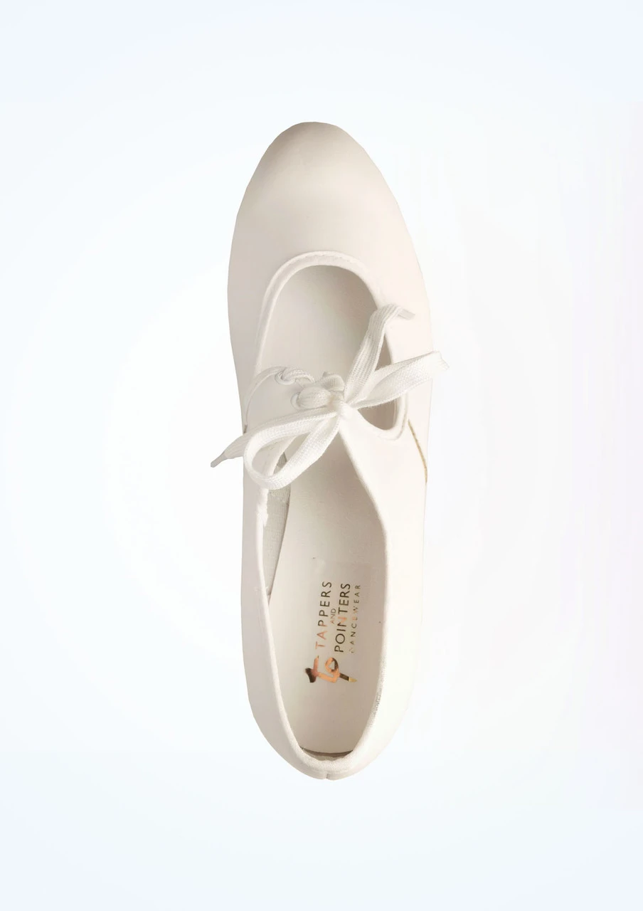 Tappers and Pointers white cuban heel tap shoes with laces. A great beginner’s tap shoe. Heel tap sold separately.