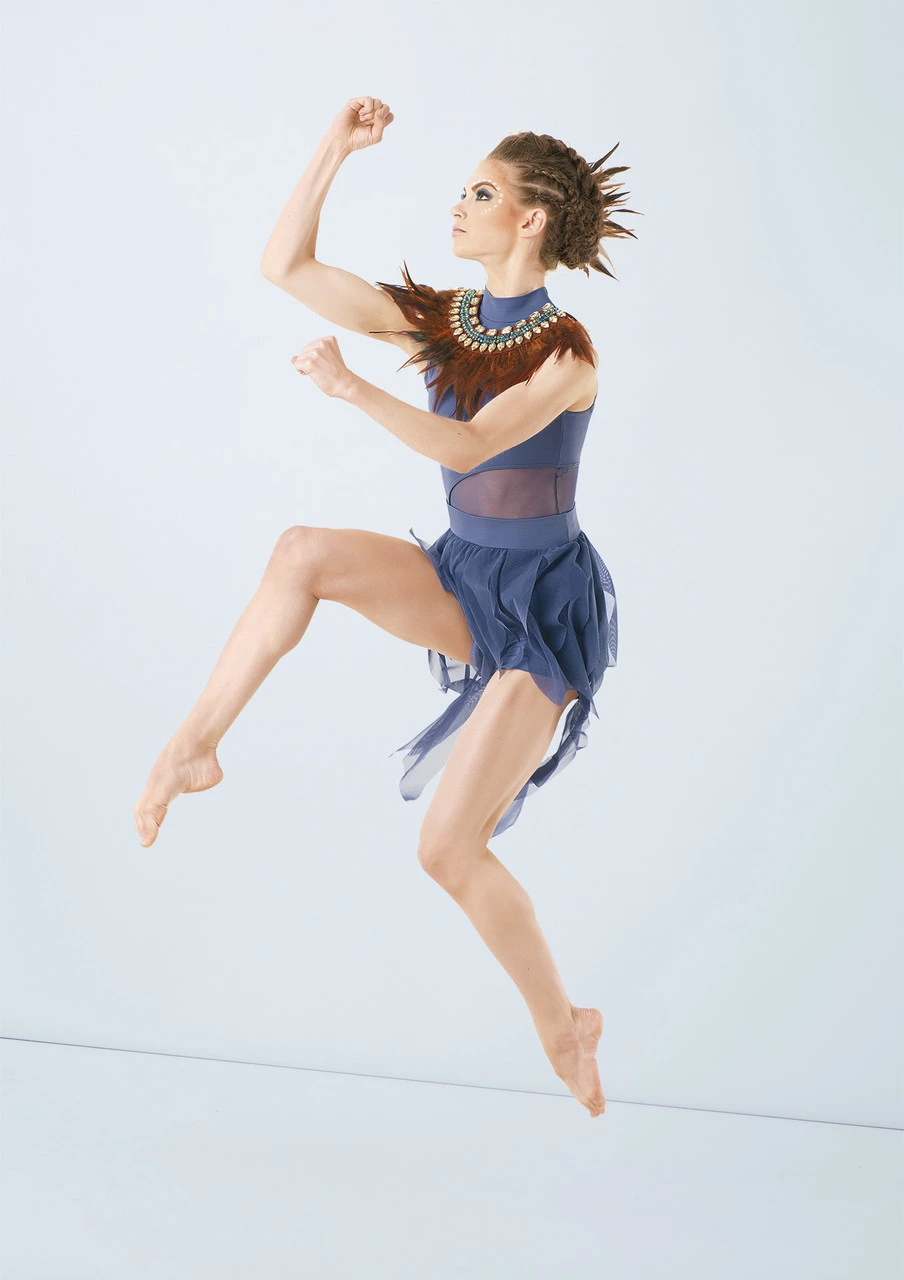 Take a trip to the wild side with this tribal-themed costume made up of mesh, feathers and beaded detailing. This fun costume illustrates your movements beautifully thanks to the tattered hem skirt which gives a cool, choppy look. The feather detailing around the neckline draws attention and matches the hair accessory perfectly.