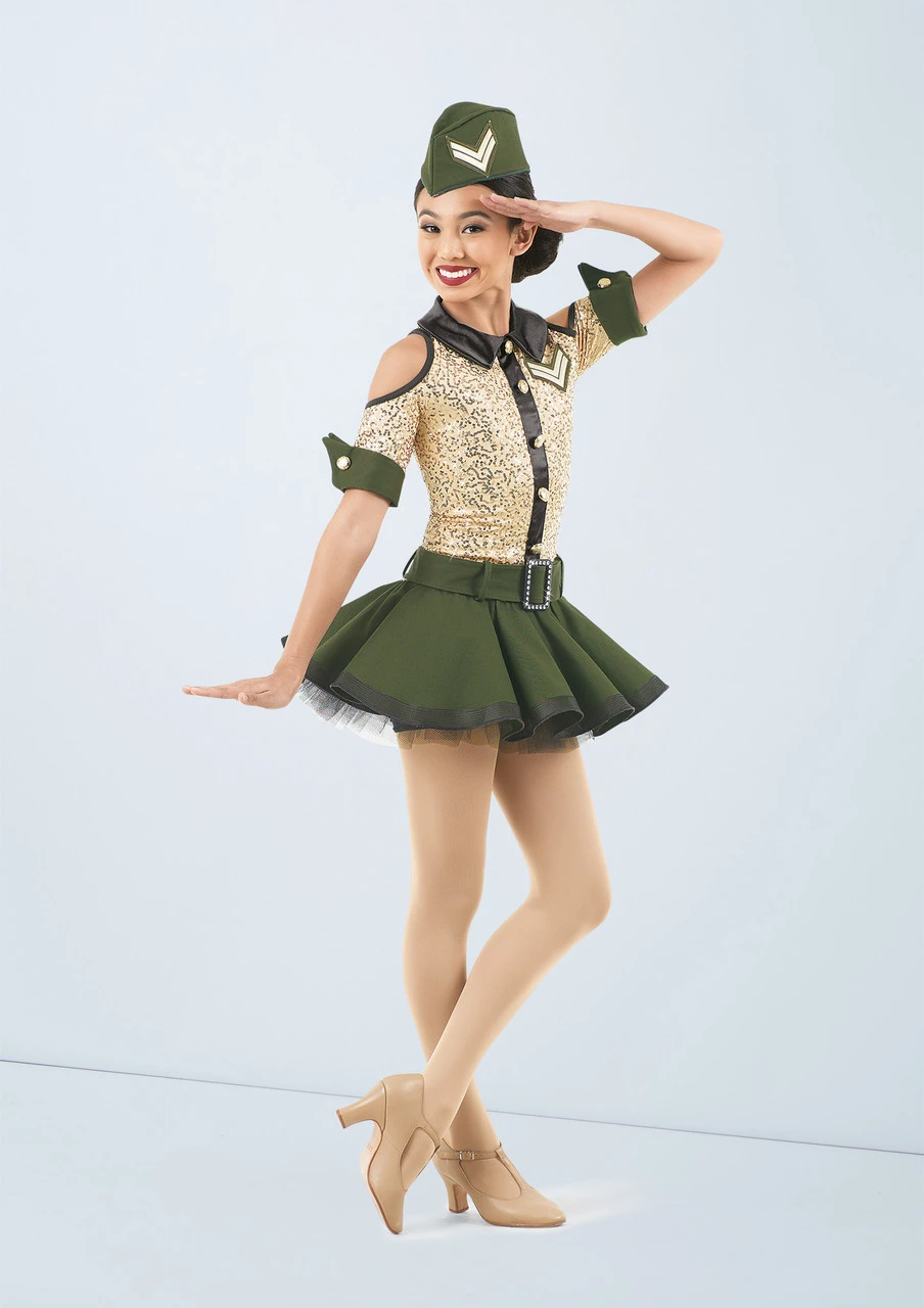 Stand to attention in this military-inspired dress with a sequined bodice and cold shoulder cutouts. This fun outfit features an attached skirt with a detailed belt and a matching military-style hat. The attached shorts means you can dance in both comfort and confidence whilst wearing this costume.